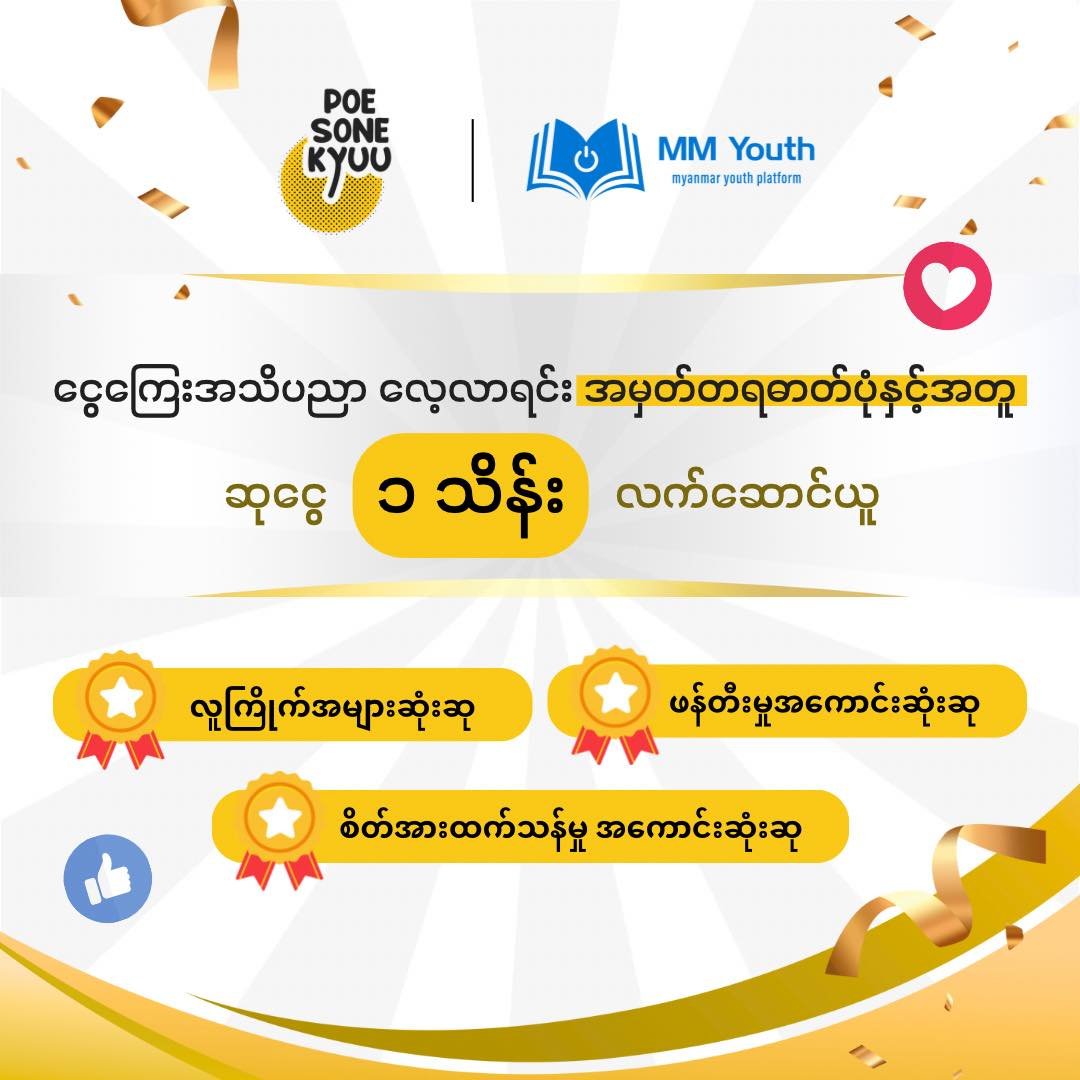 ဆုသုံးဆုလုံးကို မြန်မာငွေ ကျပ် (၁)သိန်း စီ ချီးမြှင့်သွားမှာ ဖြစ်ပါတယ်။